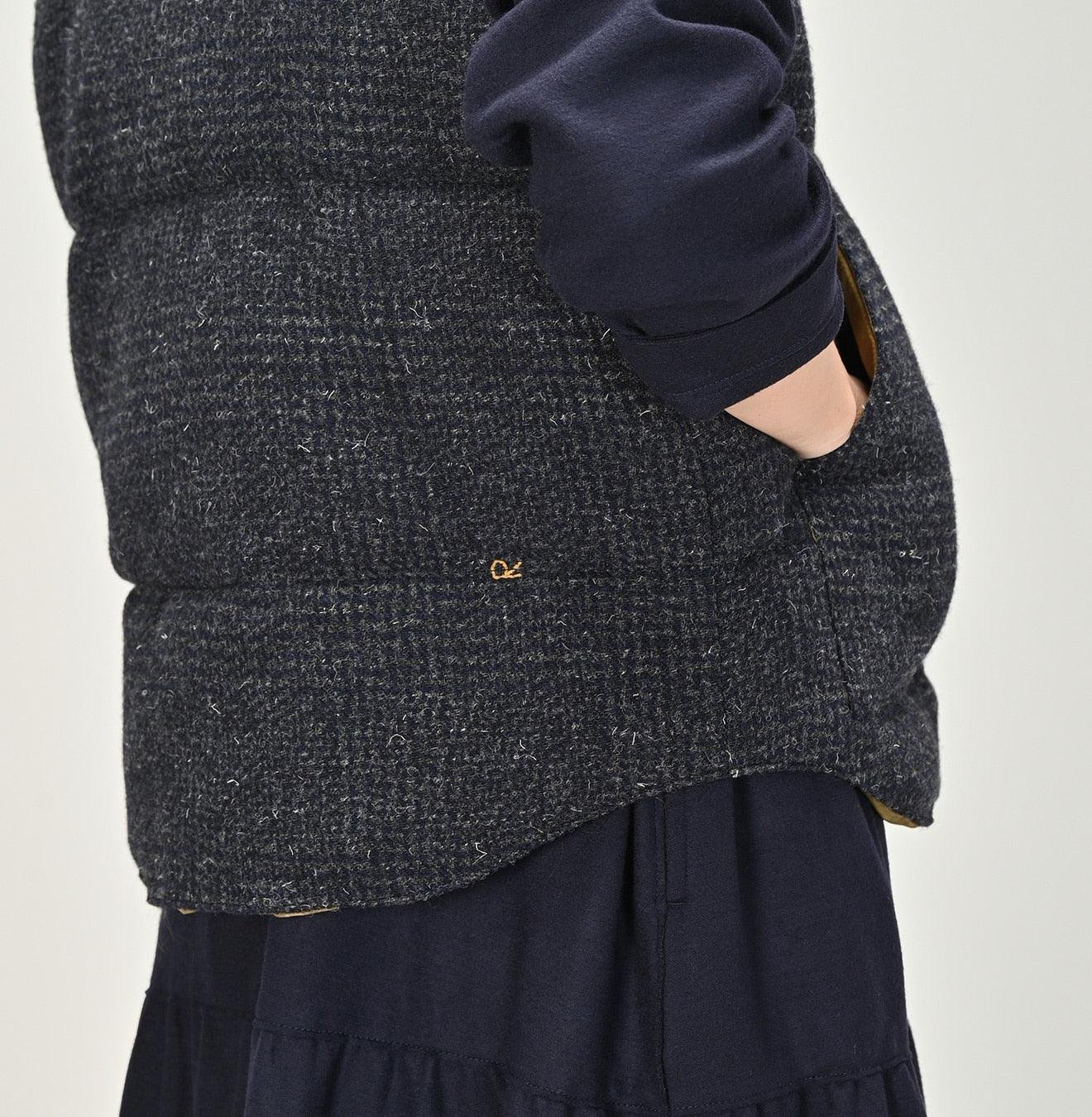 45R proudly continues its longstanding tradition of using Shetland Tweed. this time in collaboration with the prestigious Fox Brothers. a renowned textile manufacturer from England. Blending crimped British wool with fine lambswool fibers. the result is a tweed that balances classic texture with a touch of elegance. The rich. deep hues woven into the fabric exude a commanding presence. while its dry exterior belies the incredibly soft. surprisingly lightweight feel upon touch. Over time. this piece will mold to your body. becoming a cherished garment to be worn for years to come.