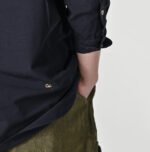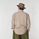This shirt features a hidden placket and a small. neatly placed pocket that adds a subtle accent. The garment dyeing process brings out the texture of the stitching. giving it a lived-in character.