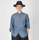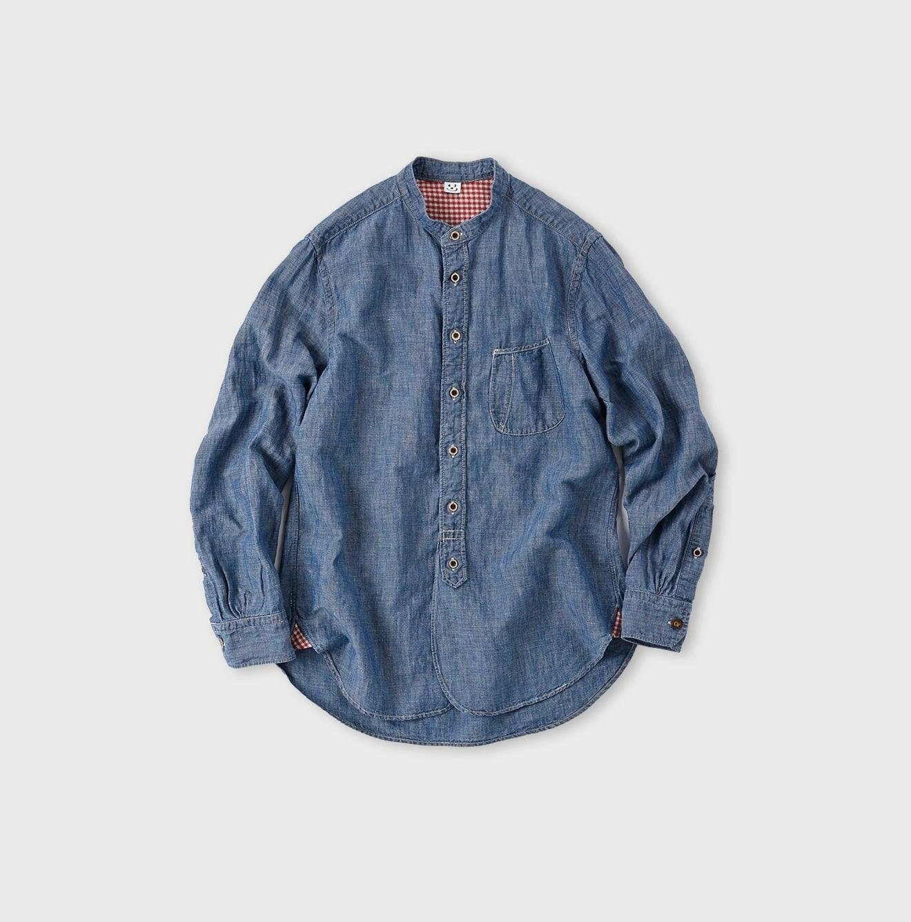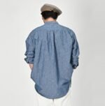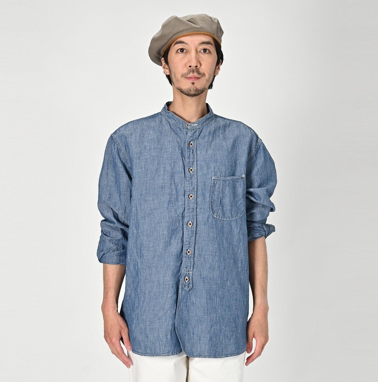 The Cotton Linen Dungaree 908 Loafer Stand Collar Shirt Tan by 45R draws inspiration from the style of American Ivy Leaguers of the 1950s. This loafer shirt features a sleek. slim silhouette with a rounded hem and a stand collar for a more casual and relaxed look.