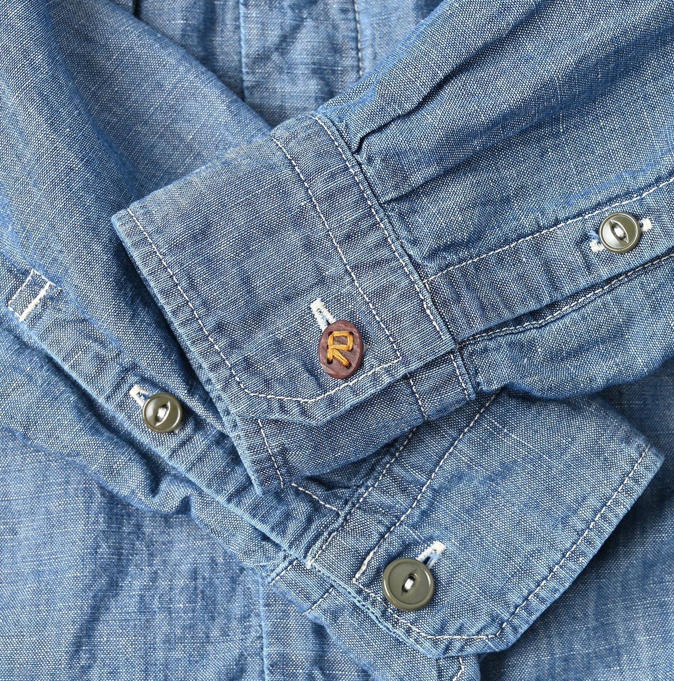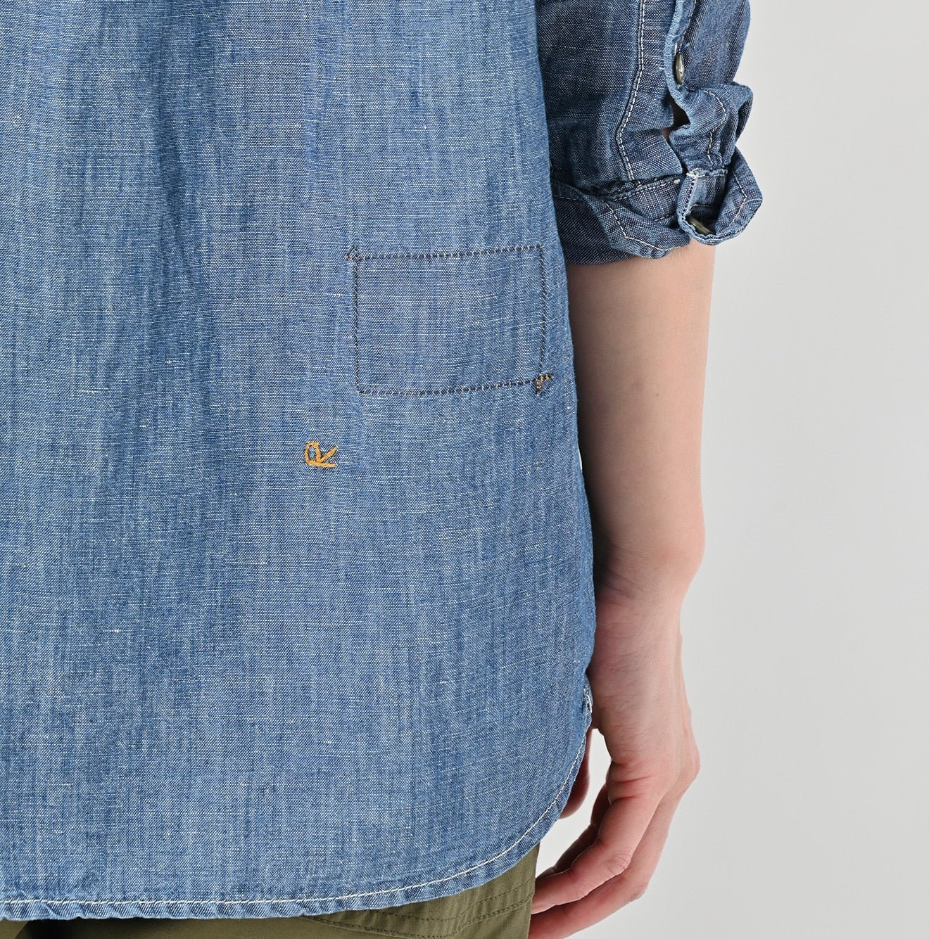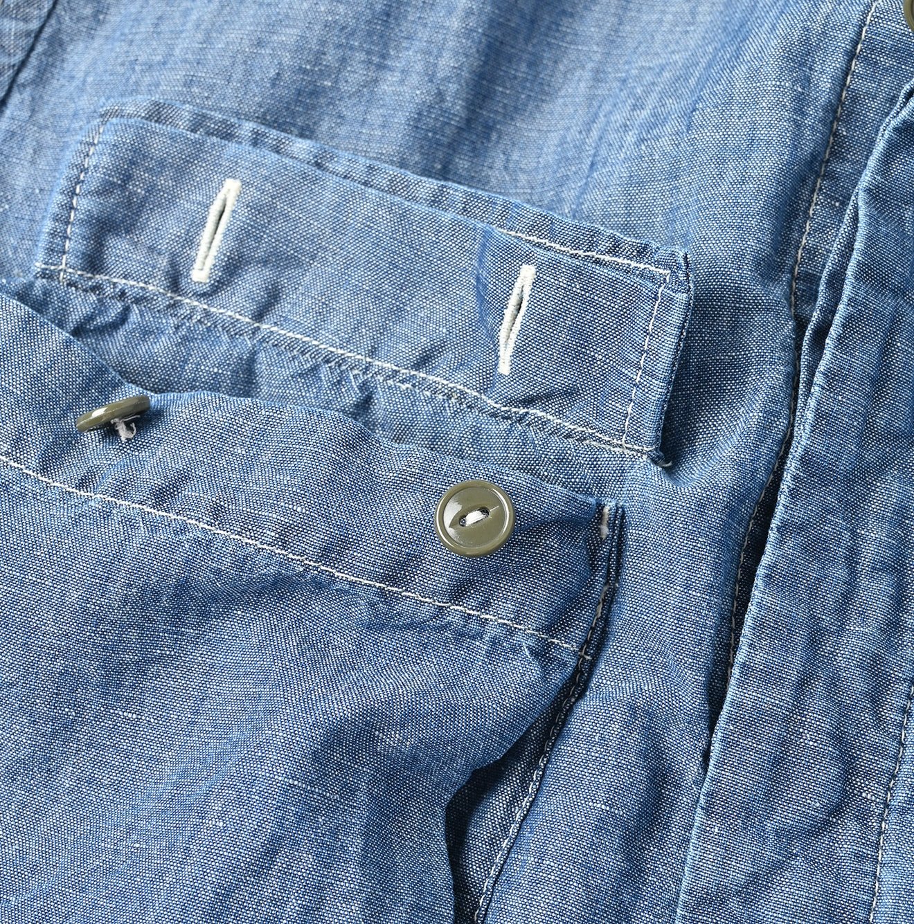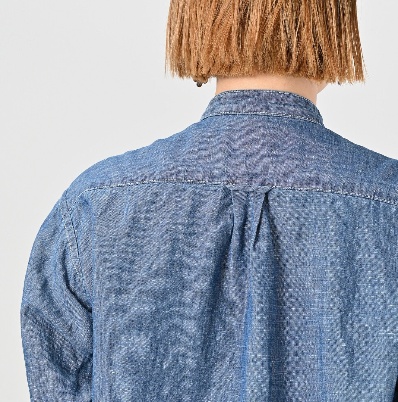 Crafted from a woven blend of flax-colored linen and indigo blue. this dungaree fabric has a natural lightness that pairs beautifully with the feel of a sea breeze. The linen. now a rare and valuable material. lends the shirt both structure and fullness. Its textured. grainy finish evokes the refreshing sensation of summer against the skin.