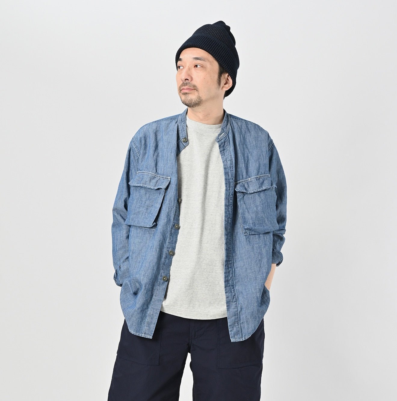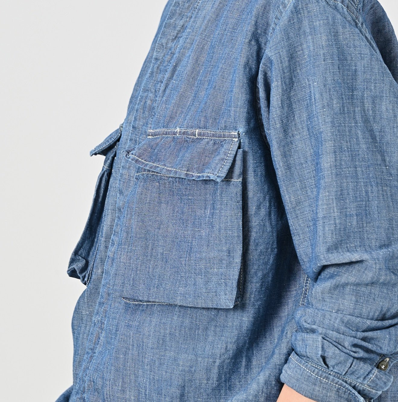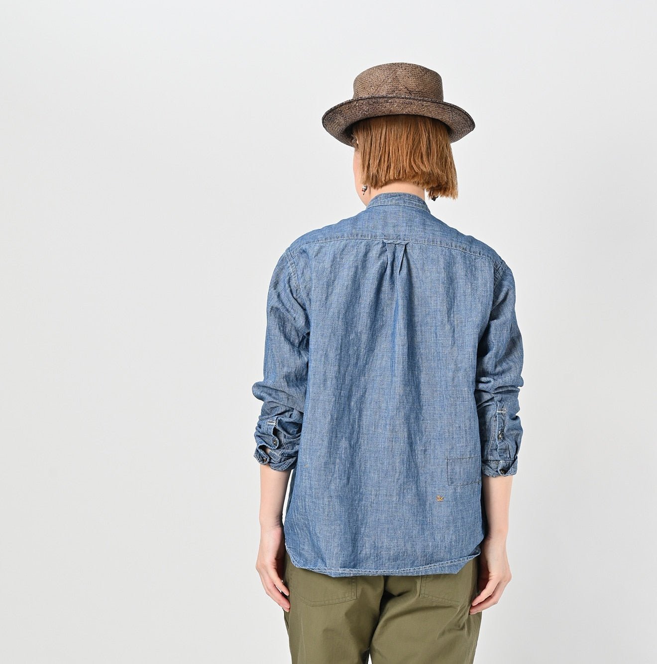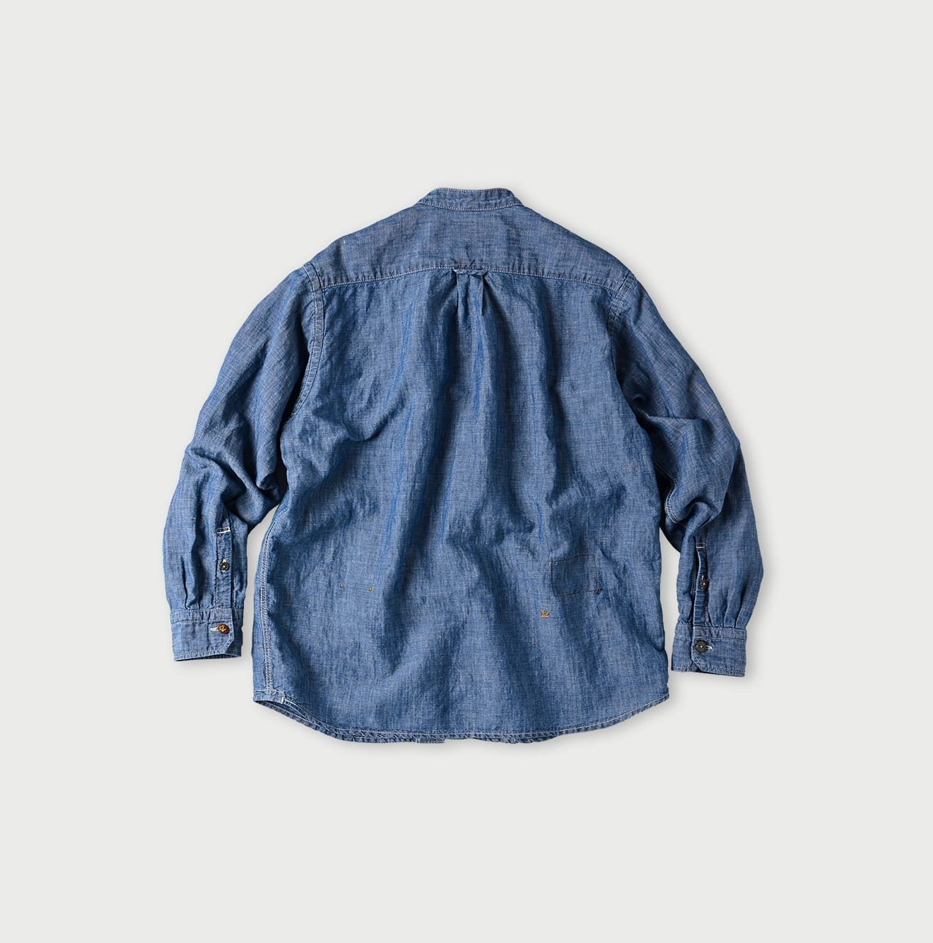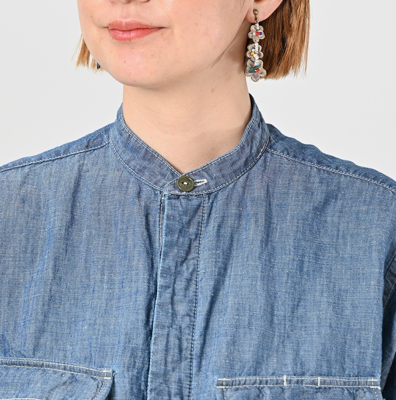 Crafted from a woven blend of flax-colored linen and indigo blue. this dungaree fabric has a natural lightness that pairs beautifully with the feel of a sea breeze. The linen. now a rare and valuable material. lends the shirt both structure and fullness. Its textured. grainy finish evokes the refreshing sensation of summer against the skin.