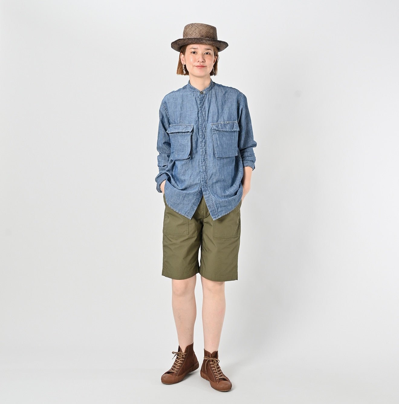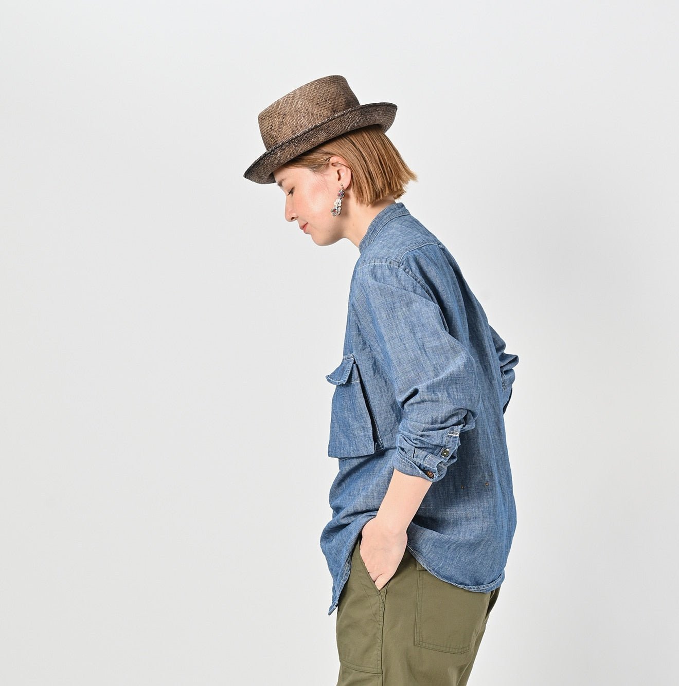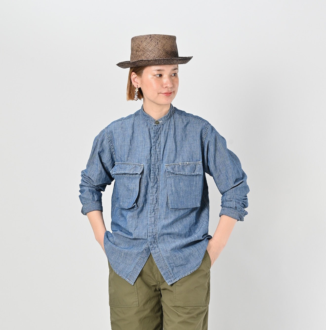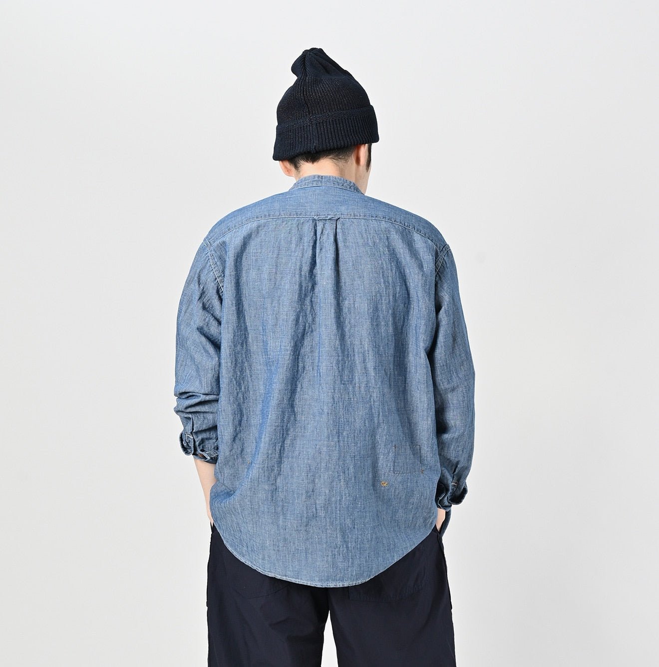 Crafted from a woven blend of flax-colored linen and indigo blue. this dungaree fabric has a natural lightness that pairs beautifully with the feel of a sea breeze. The linen. now a rare and valuable material. lends the shirt both structure and fullness. Its textured. grainy finish evokes the refreshing sensation of summer against the skin.