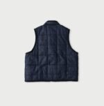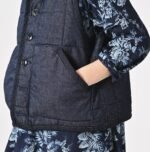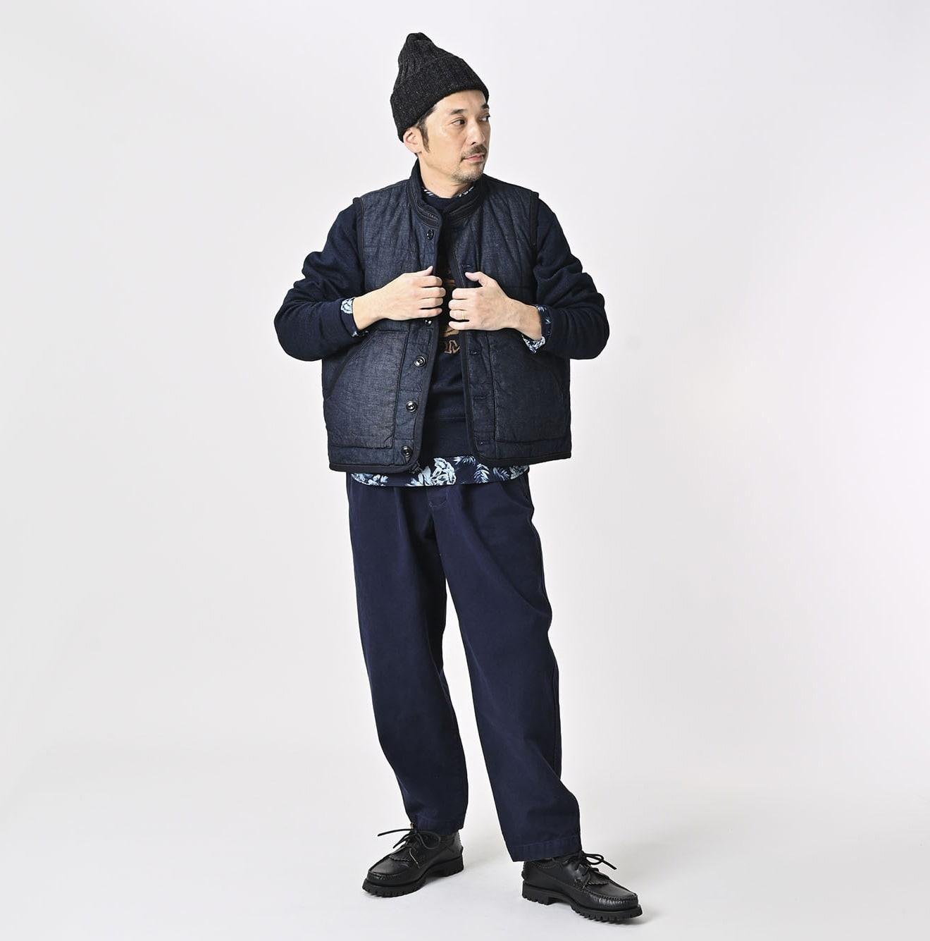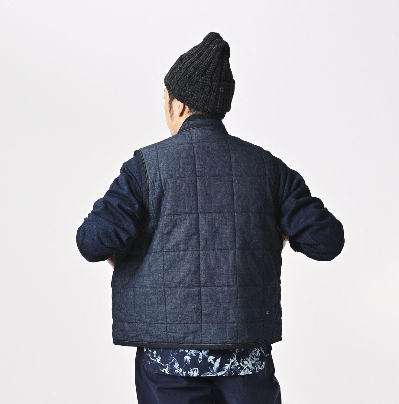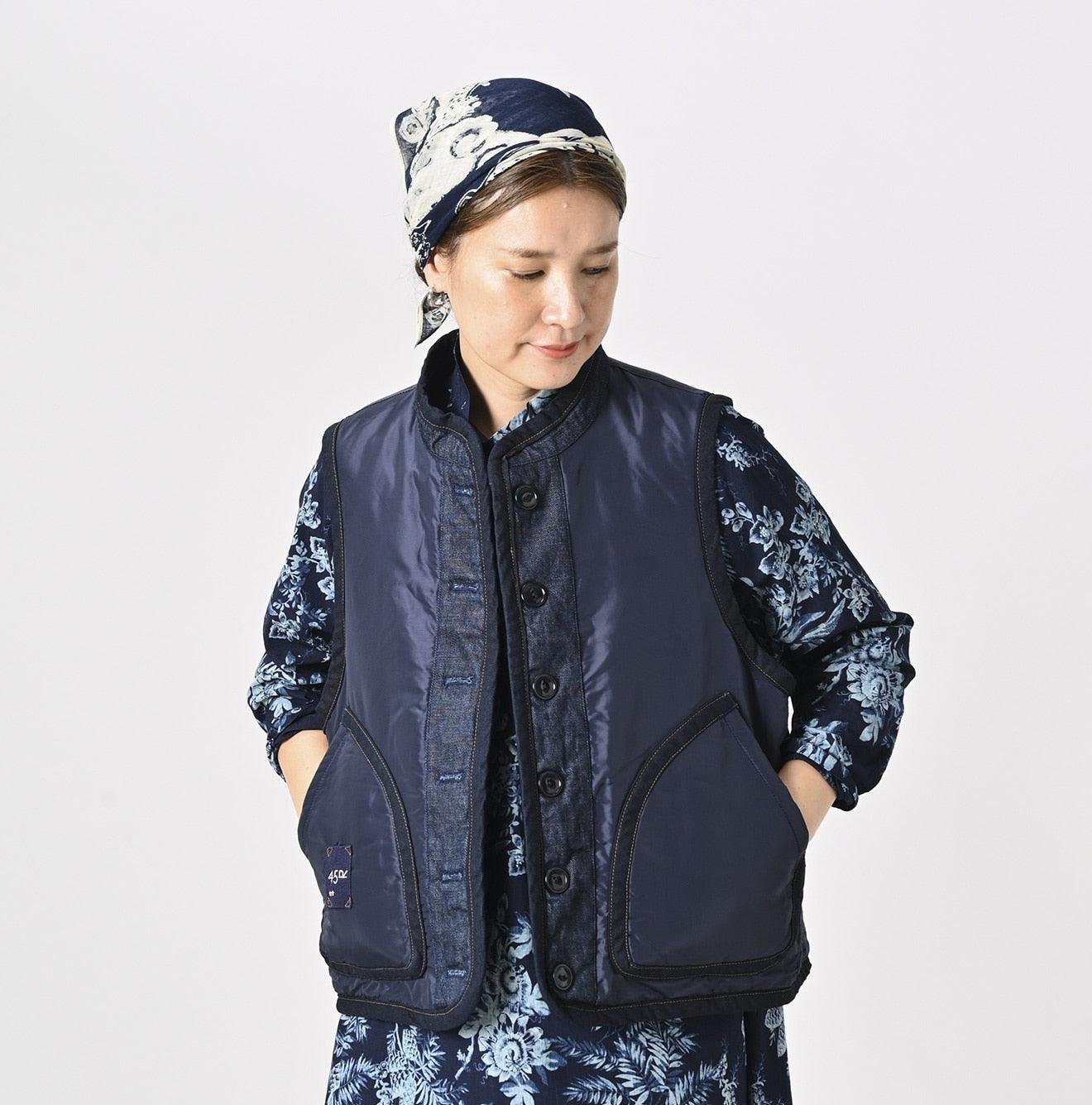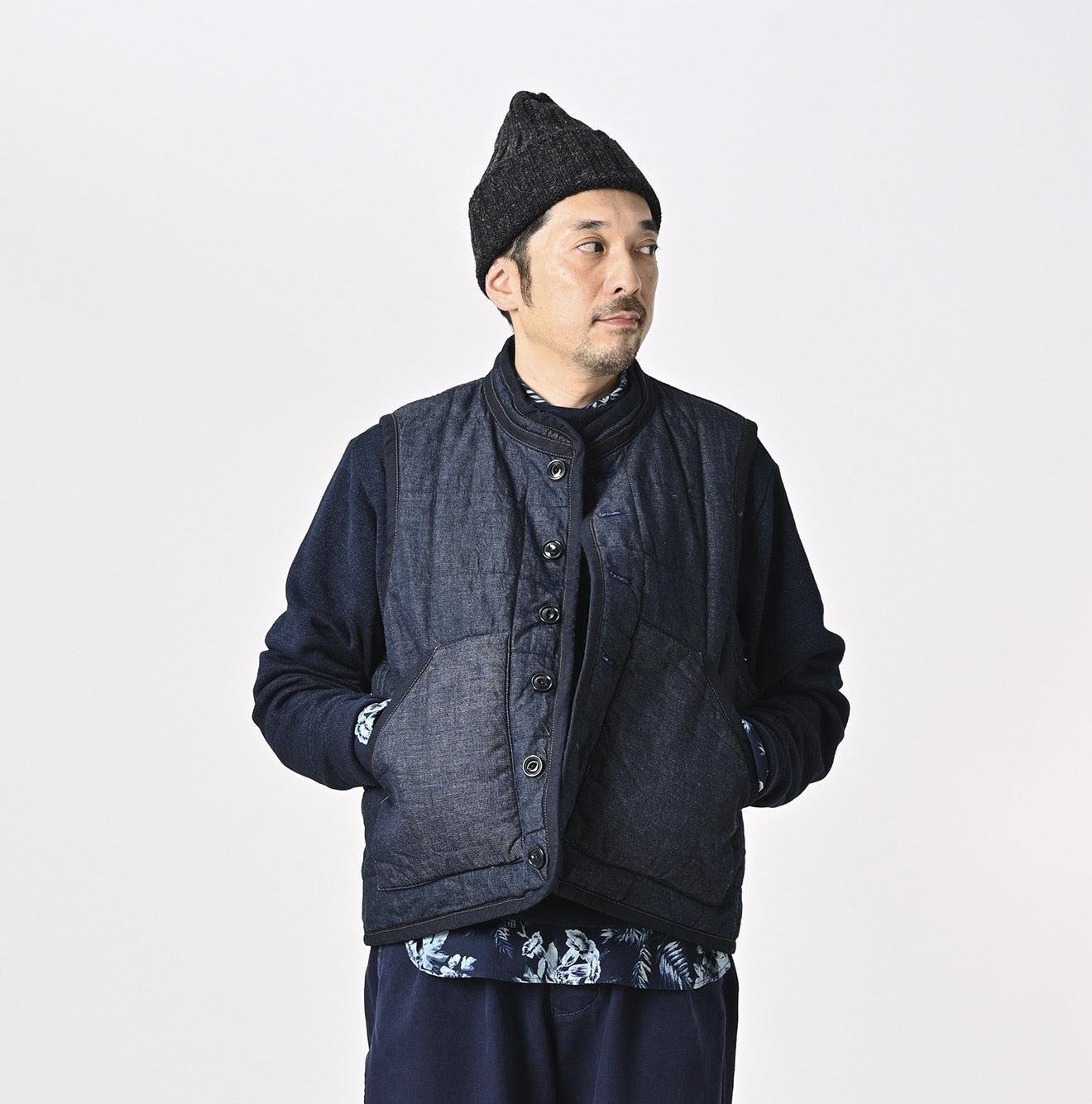 45 Petit Denim is an exceptionally lightweight fabric. offering warmth without bulk. It is also hand-washable. making it highly functional. The lining features thick nylon inspired by the nostalgic textures of American vintage styles. adding a touch of classic charm to this versatile piece. This vest exemplifies Japanese craftsmanship and thoughtful design.