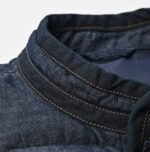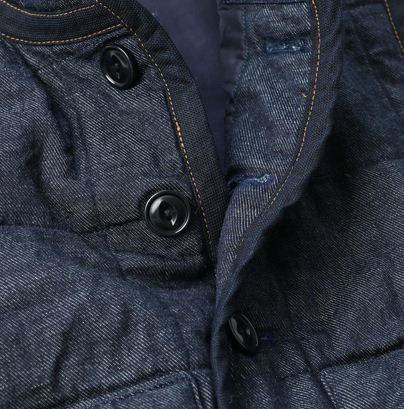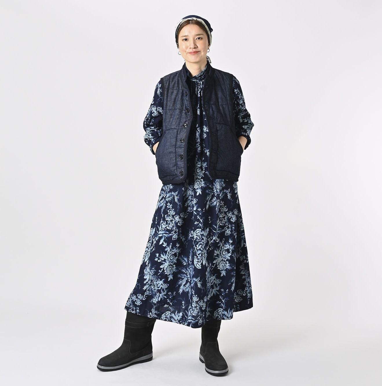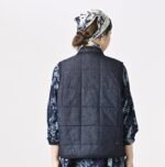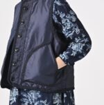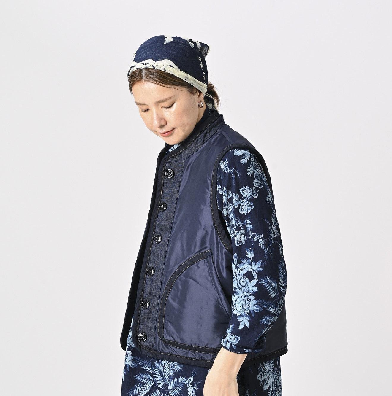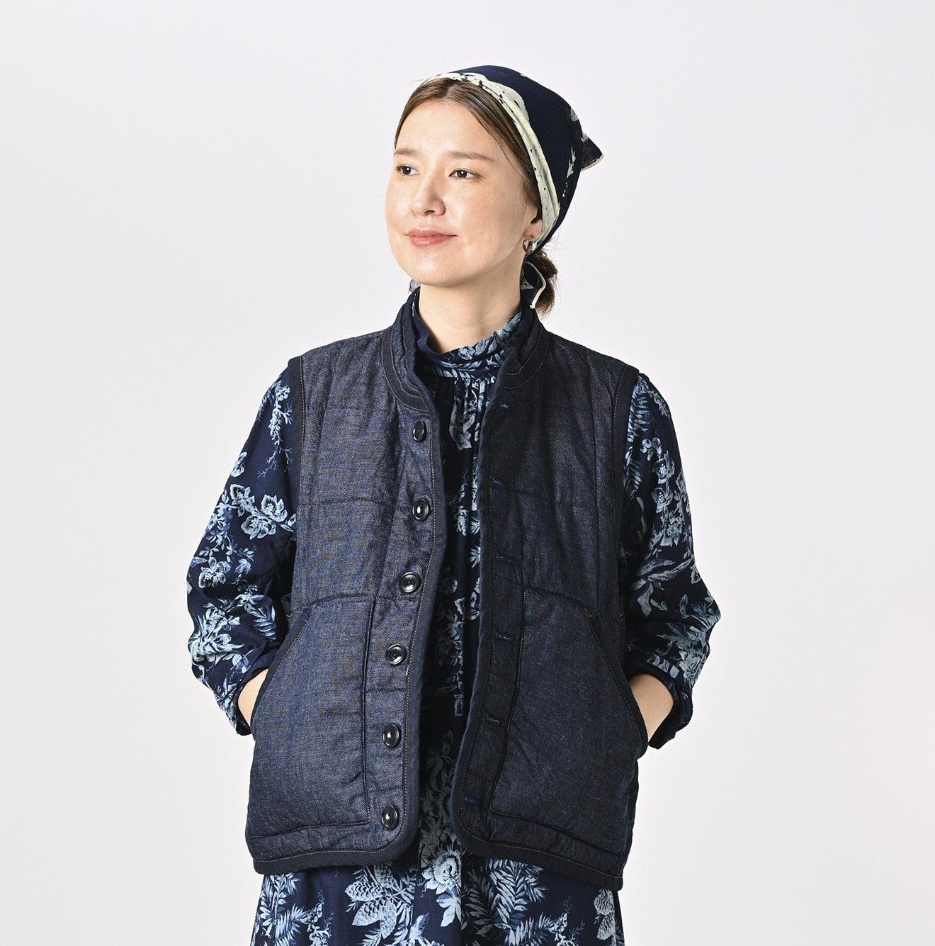 45 Petit Denim is an exceptionally lightweight fabric. offering warmth without bulk. It is also hand-washable. making it highly functional. The lining features thick nylon inspired by the nostalgic textures of American vintage styles. adding a touch of classic charm to this versatile piece. This vest exemplifies Japanese craftsmanship and thoughtful design.