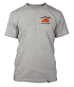 Screen print of our Tucker Snowcat graphic on a solid grey short sleeve shirt. Features a small logo on the front and a larger logo on the back. This shirt has a classic unisex fit.
